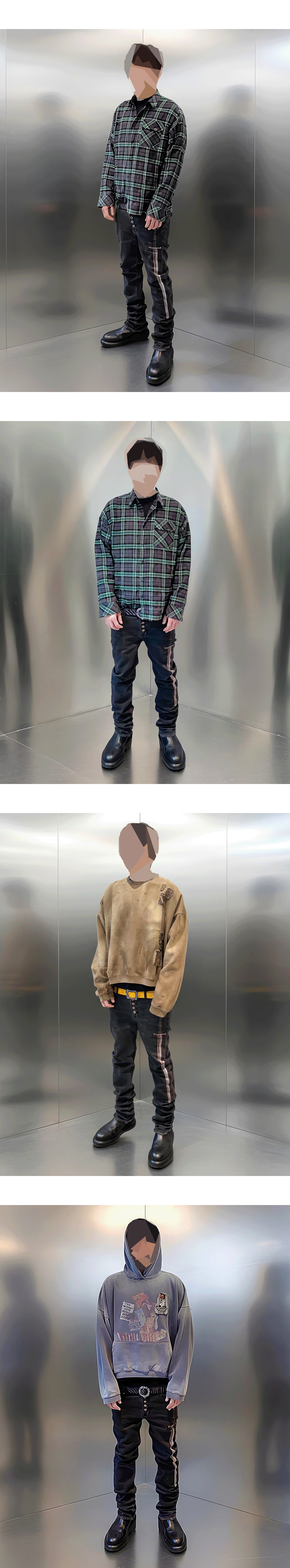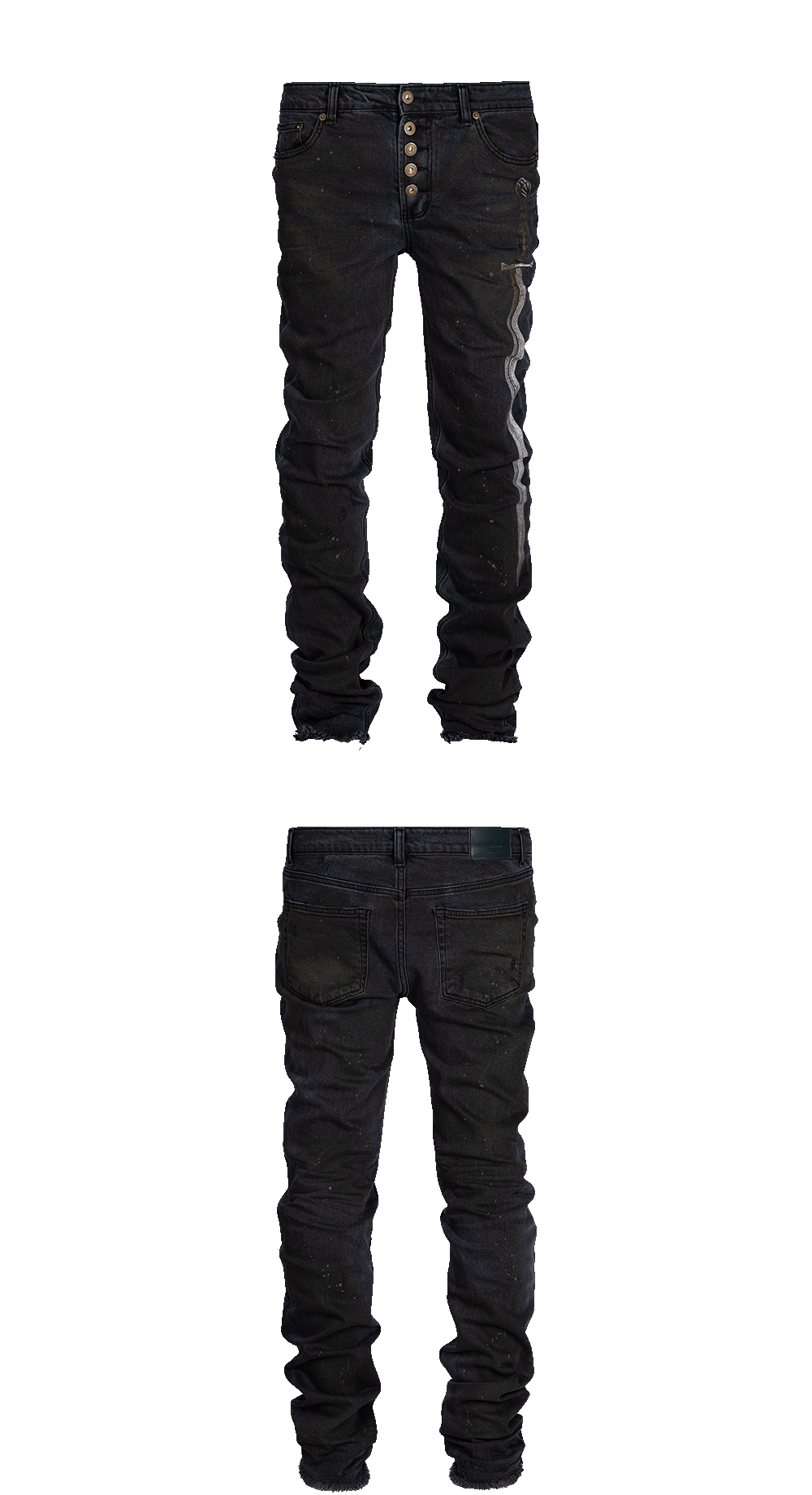 실제 블레이드 크기의 아트워크를 바지 전면부에 프린팅한 위트 있는 데님입니다.