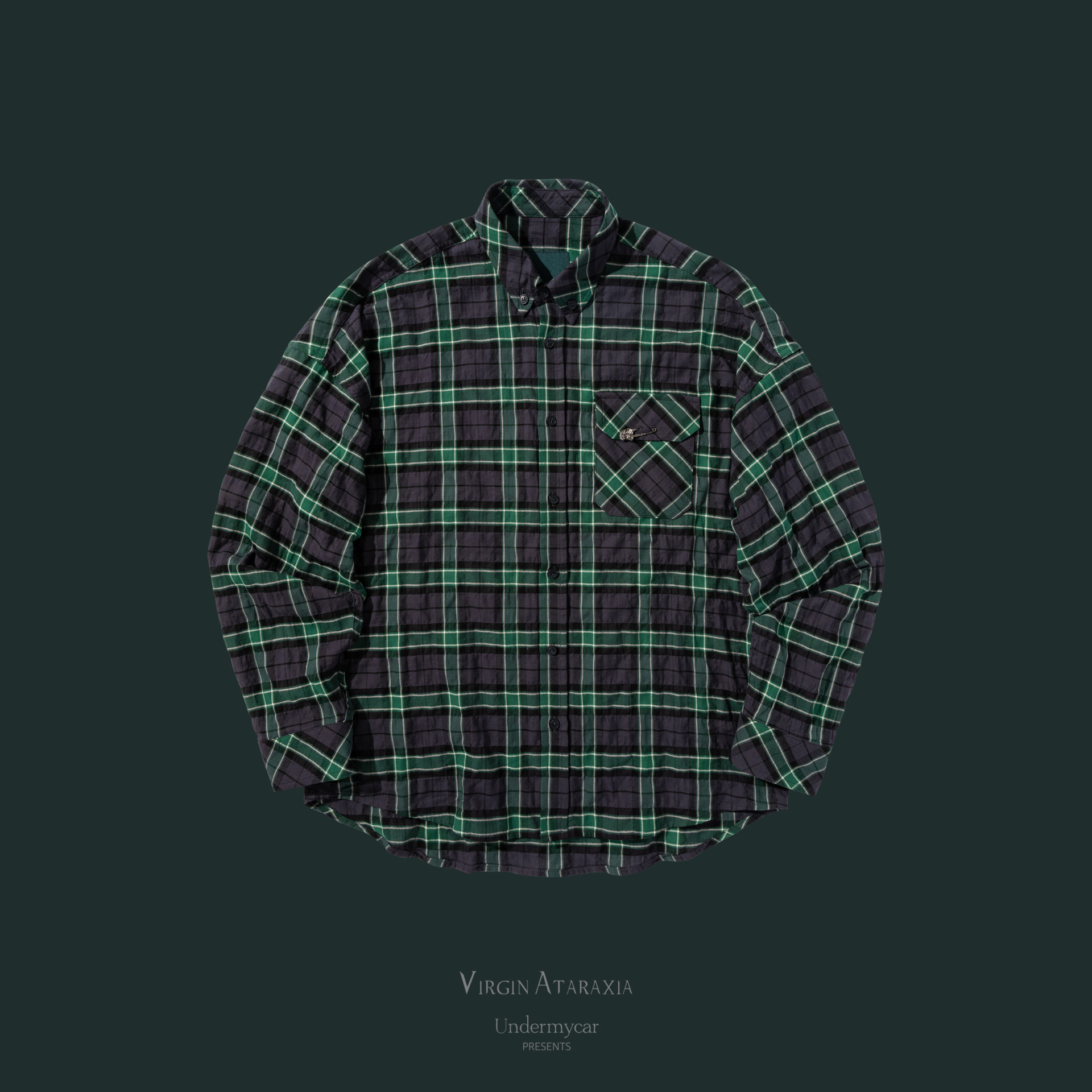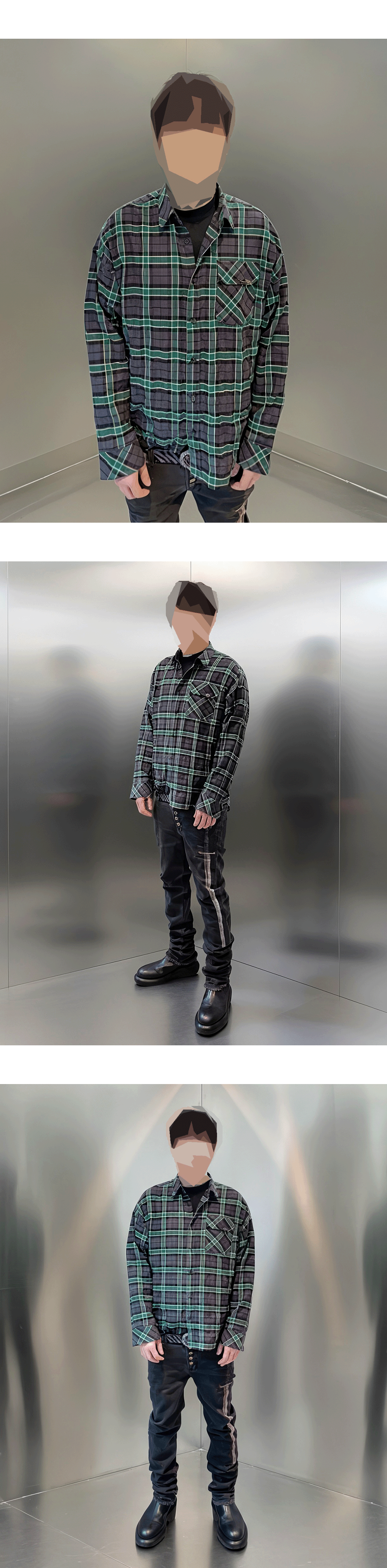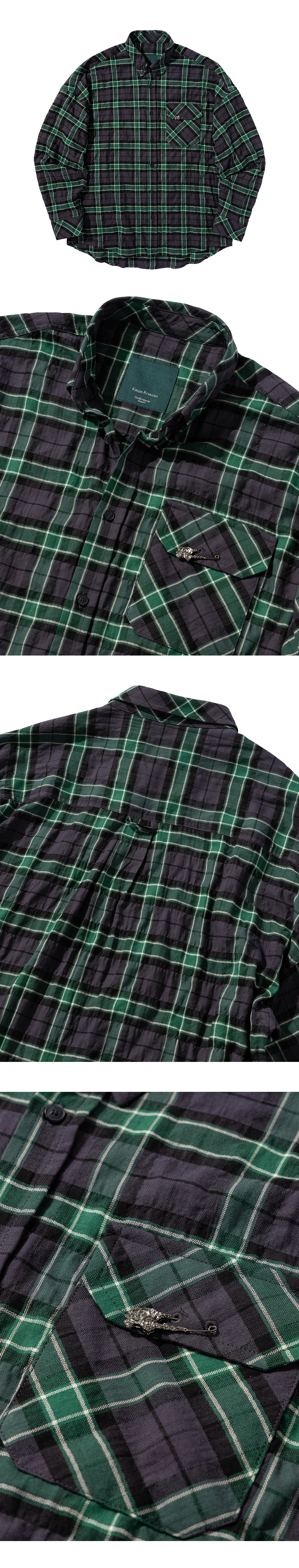 재패니즈 패브릭을 사용한 체크셔츠로, 가슴 포켓은 블랙 색상의 세이프티 핀으로 고정되어 있습니다.