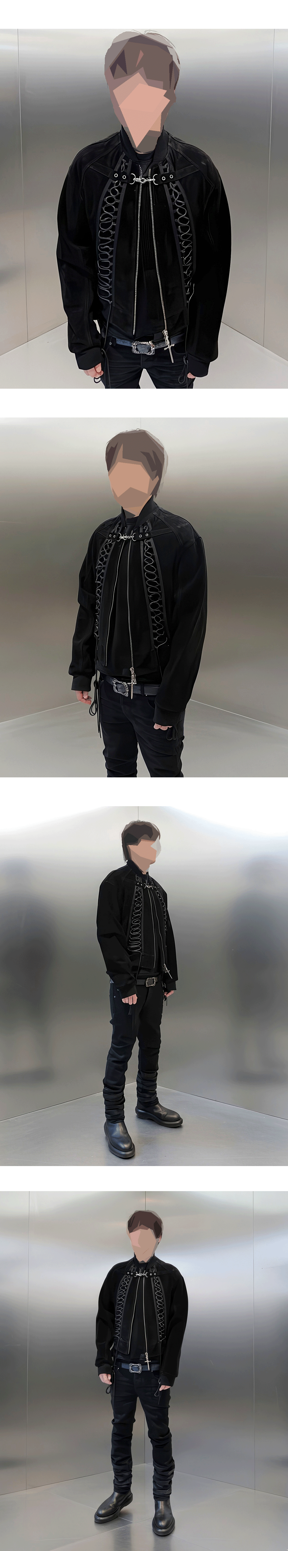 잔다르크의 체인메일을 연상시키는 스웨이드 블루종으로, 925실버로 장식된 전면부 소드 펜던트와 코르셋 디테일이 특징입니다.