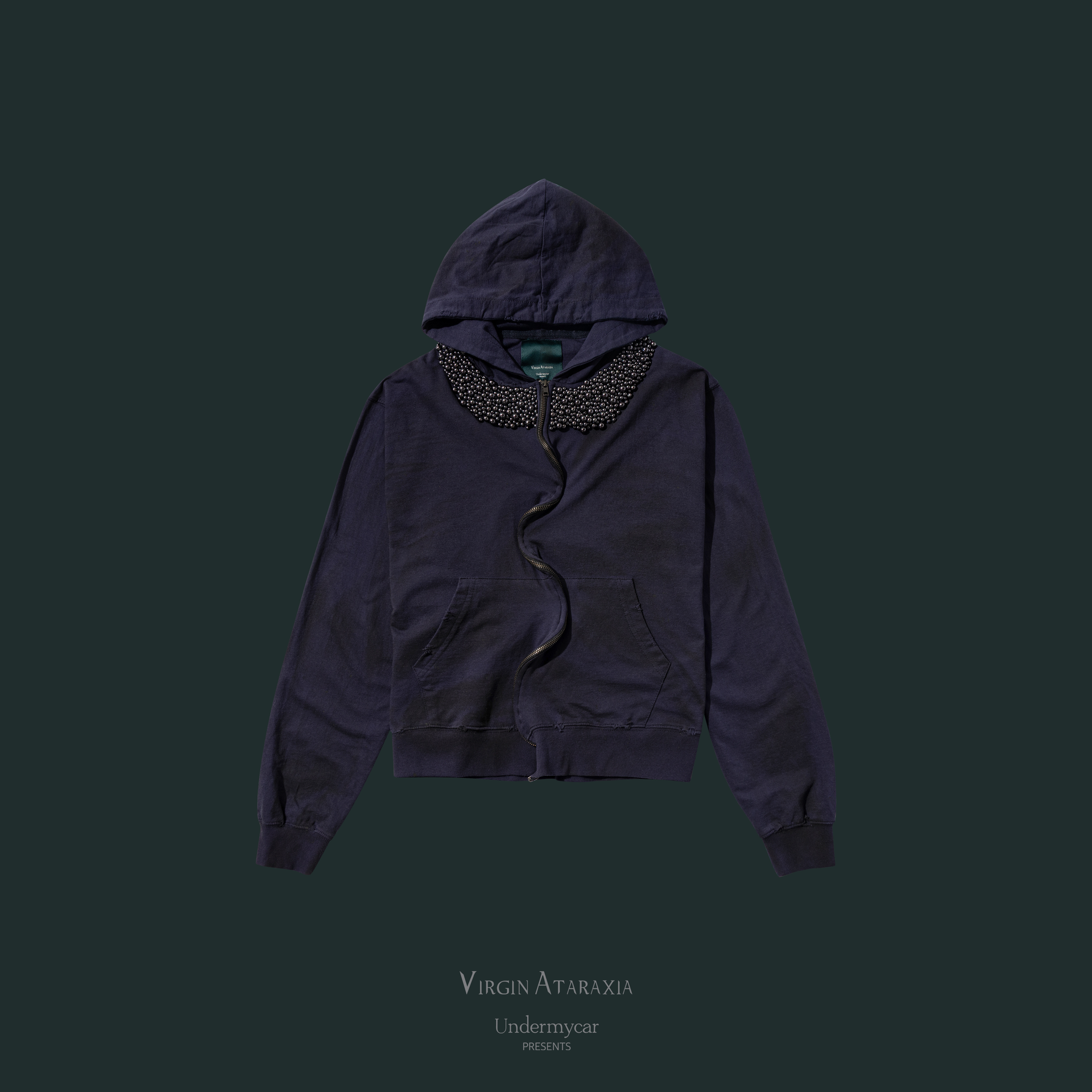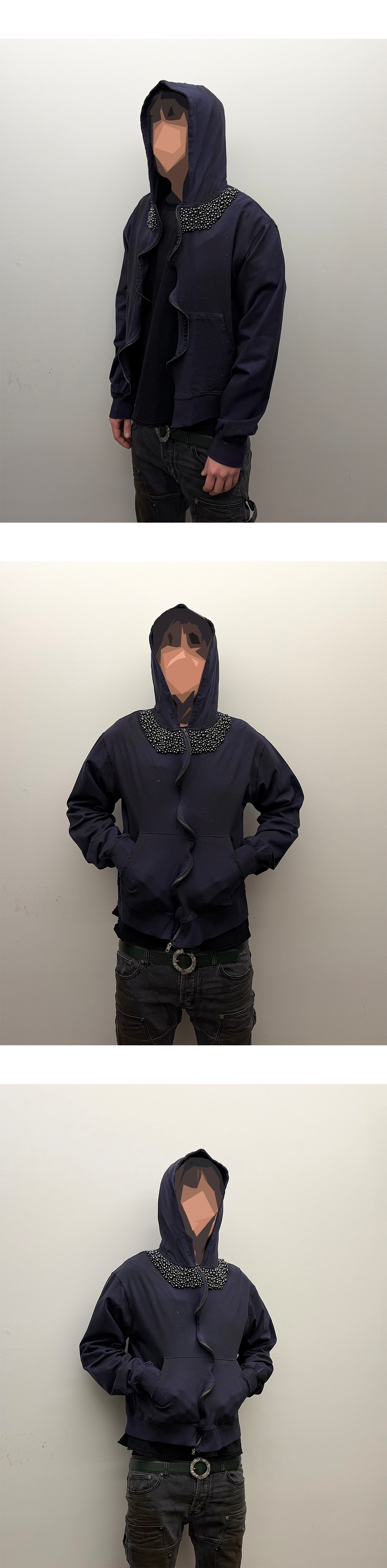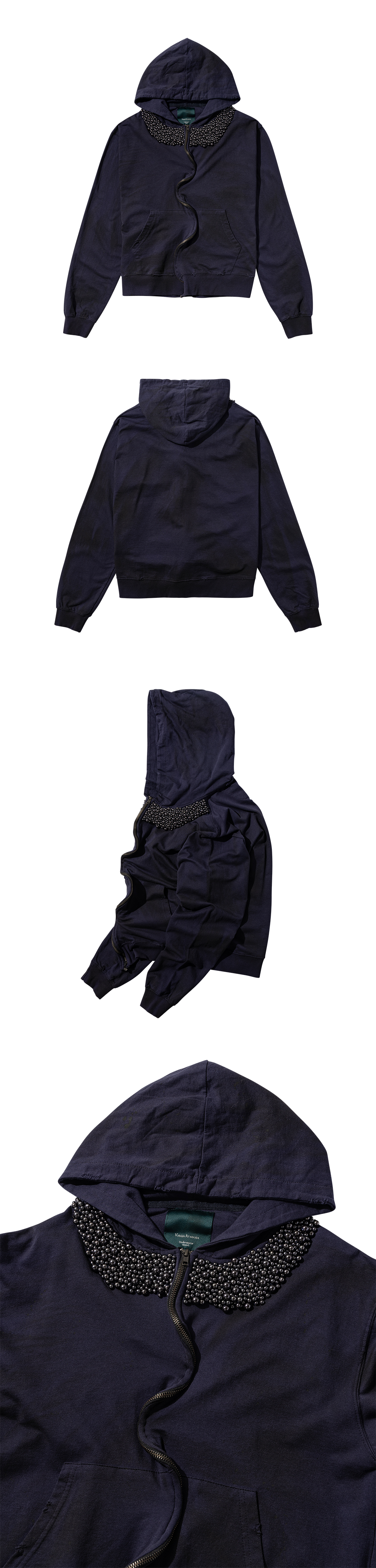 빈티지 가공 실루엣에 넥 라인 진주 디테일을 더해 감각적인 대비를 연출한 후드 집업입니다.
