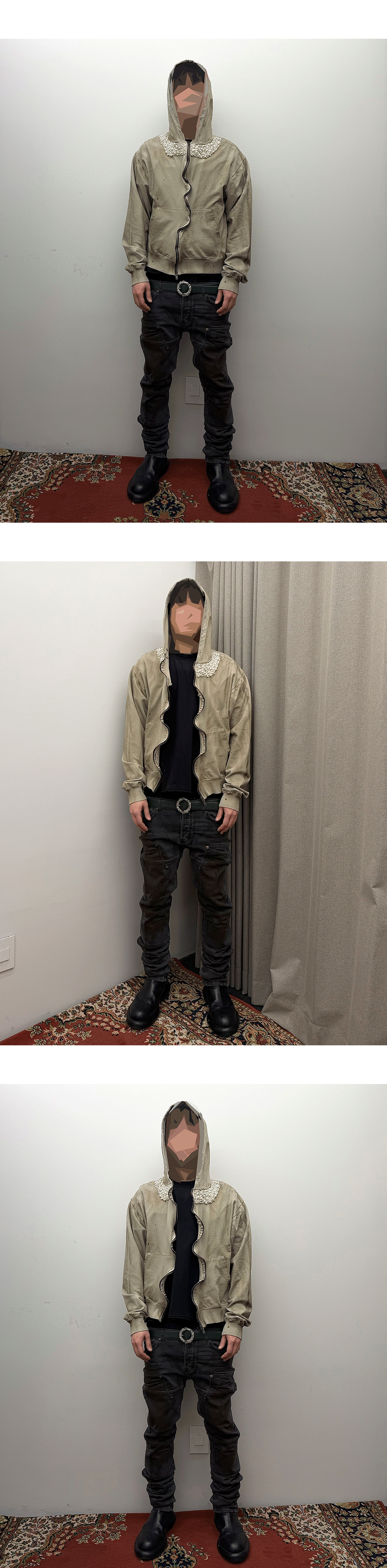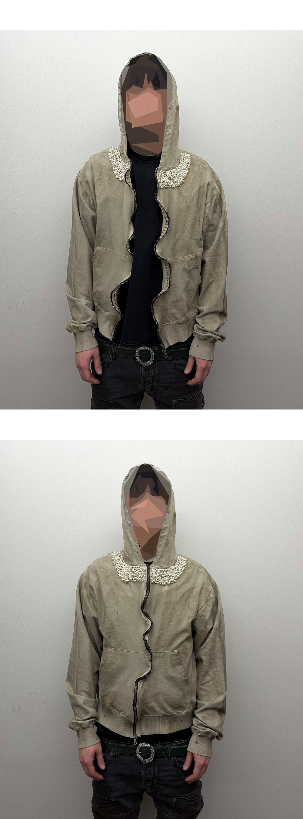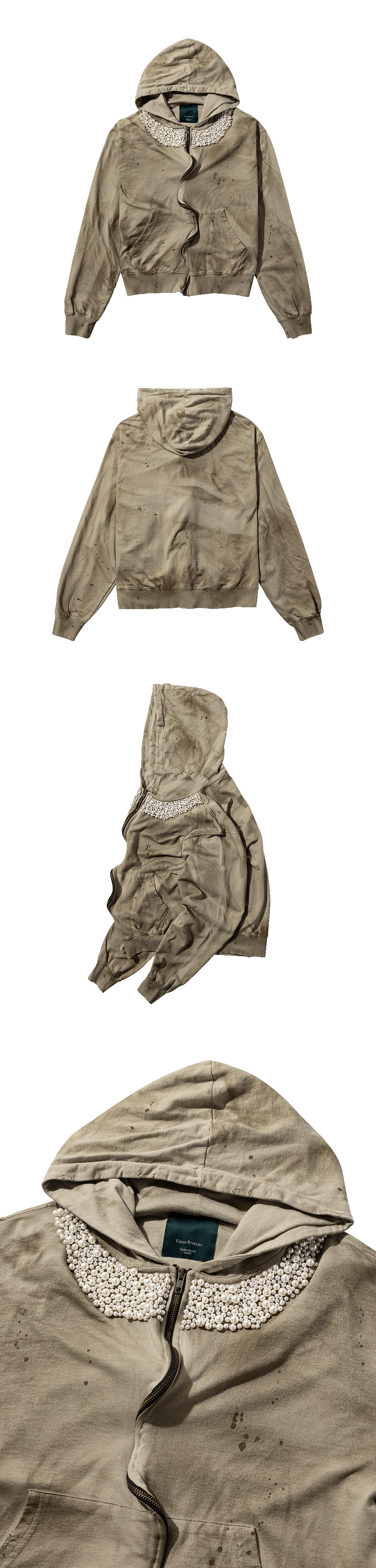 빈티지 가공 실루엣에 넥 라인 진주 디테일을 더해 감각적인 대비를 연출한 후드 집업입니다.