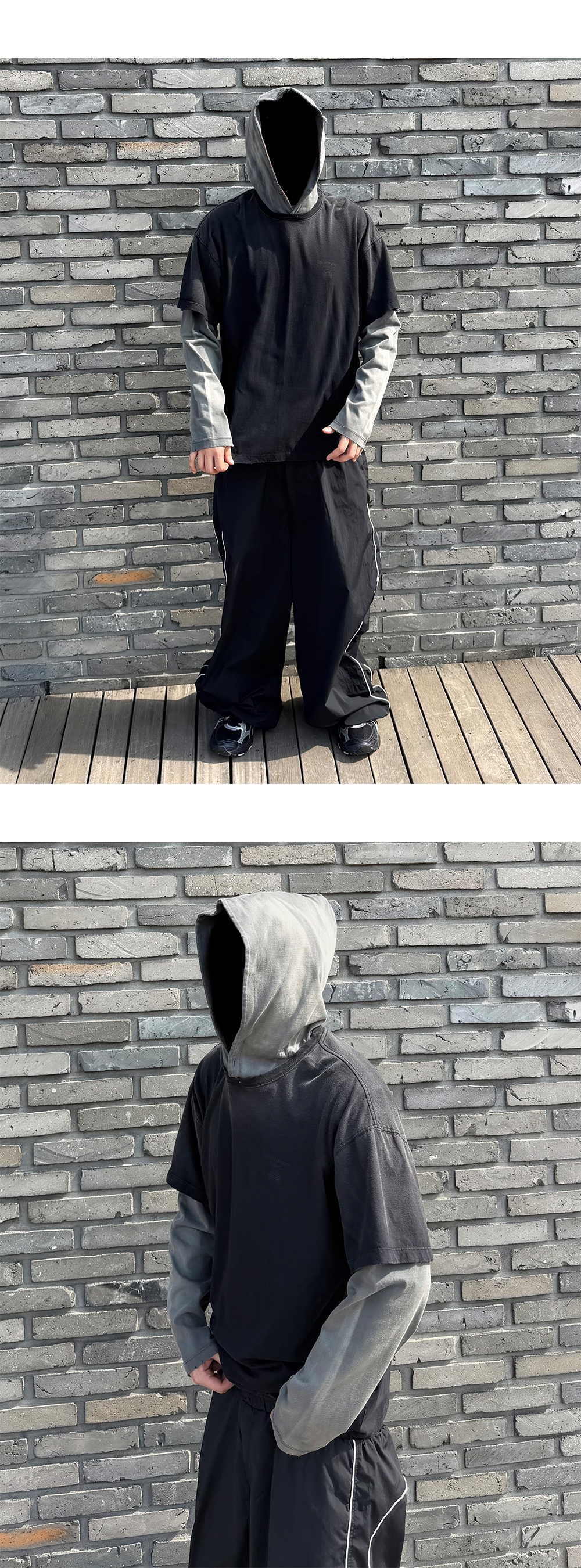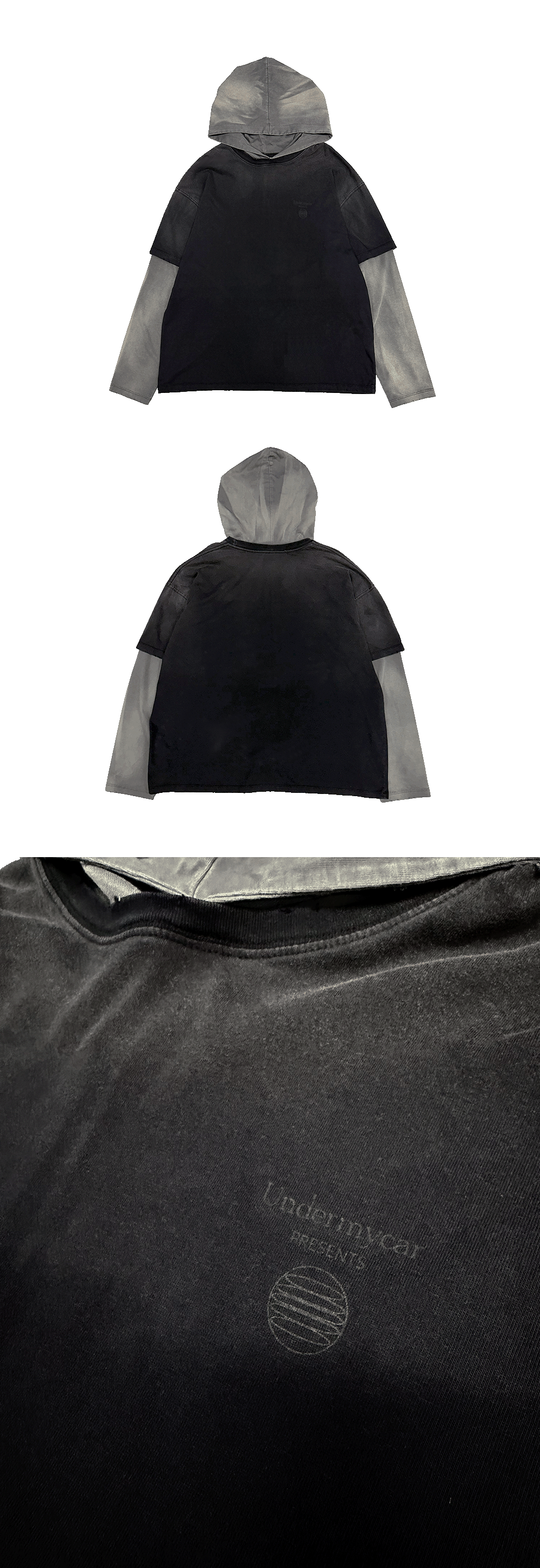 MU.131 Combi Brush Washed Layered Hoodie Black / Gray