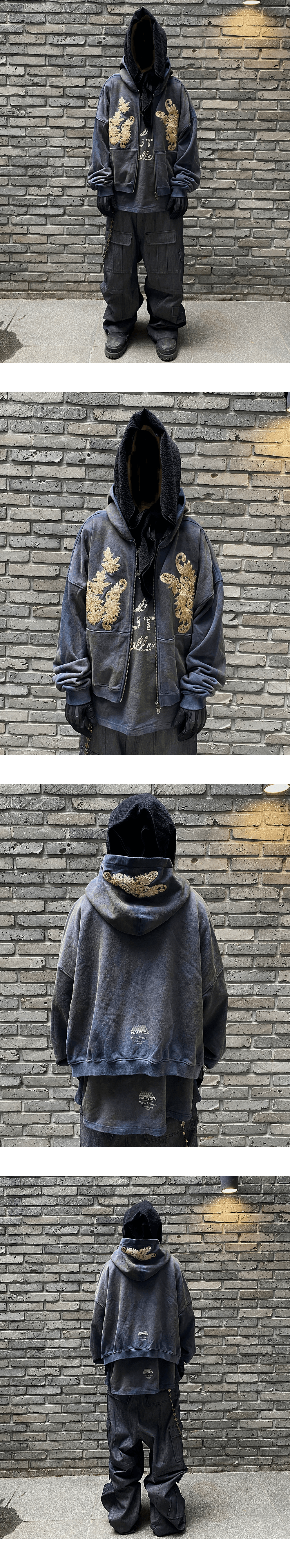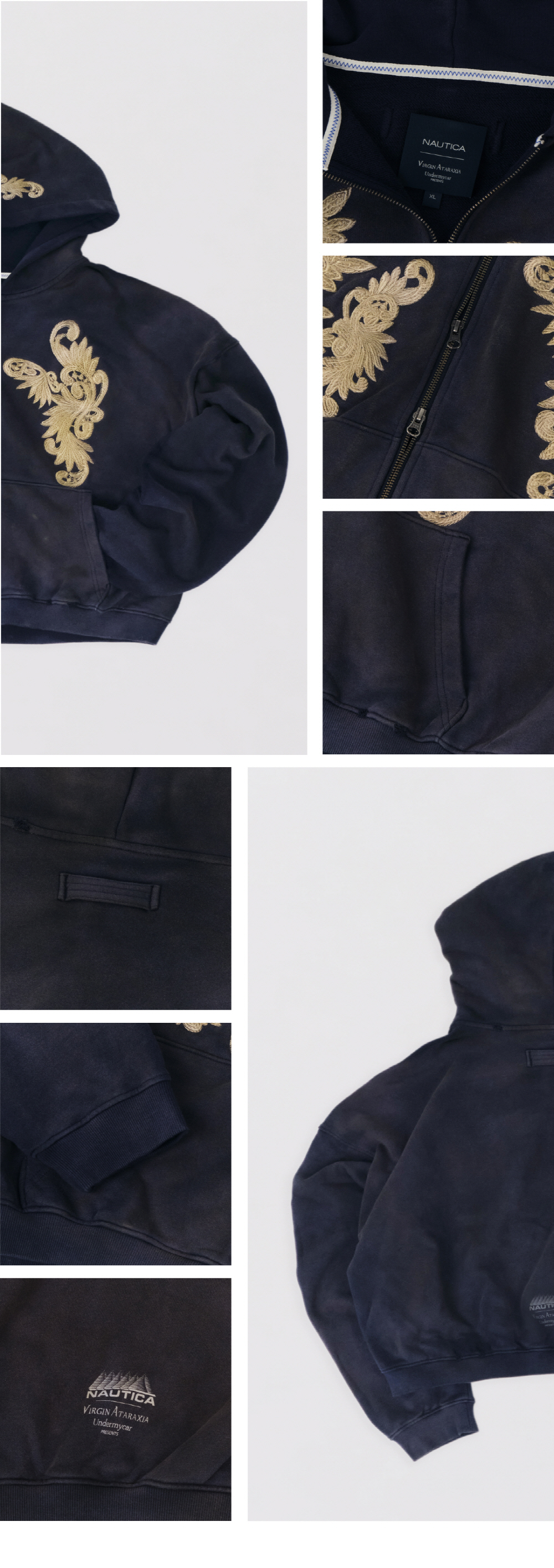언더마이카의 시그니처 후드에 노티카의 무드를 더한 후드 집업입니다. 언더마이카의 감성이 담긴 고밀도 아플리케 디테일이 특징이며, 설파 염색 기법을 활용해 자연스럽고 깊이 있는 색감을 구현, 빈티지한 무드 연출 가능합니다.