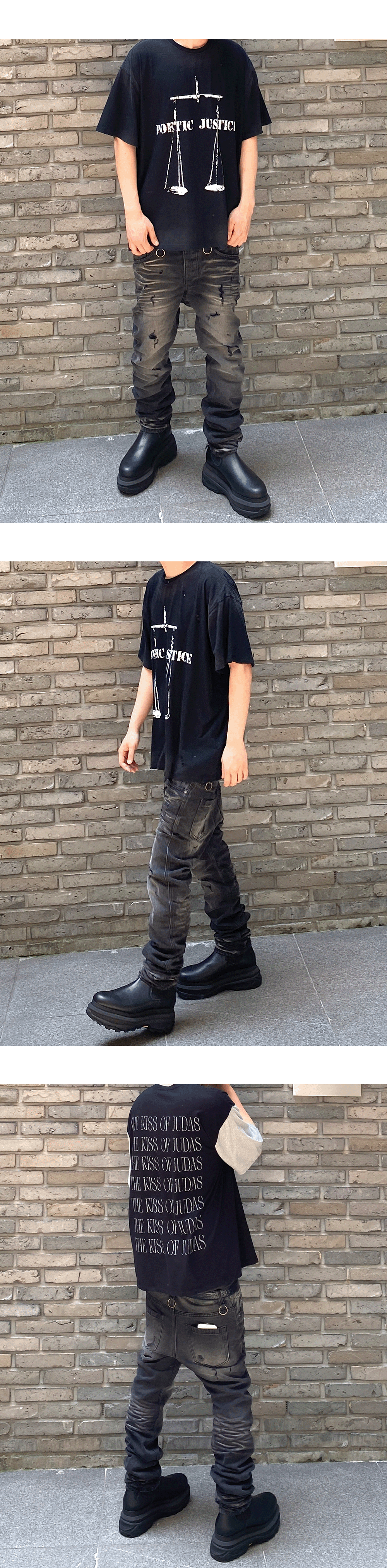 면 100% 원단의 슬림핏으로 제작되었으며 전체적으로 들어간 구제포인트와 벨트루프의 링 장식이 특징입니다.
