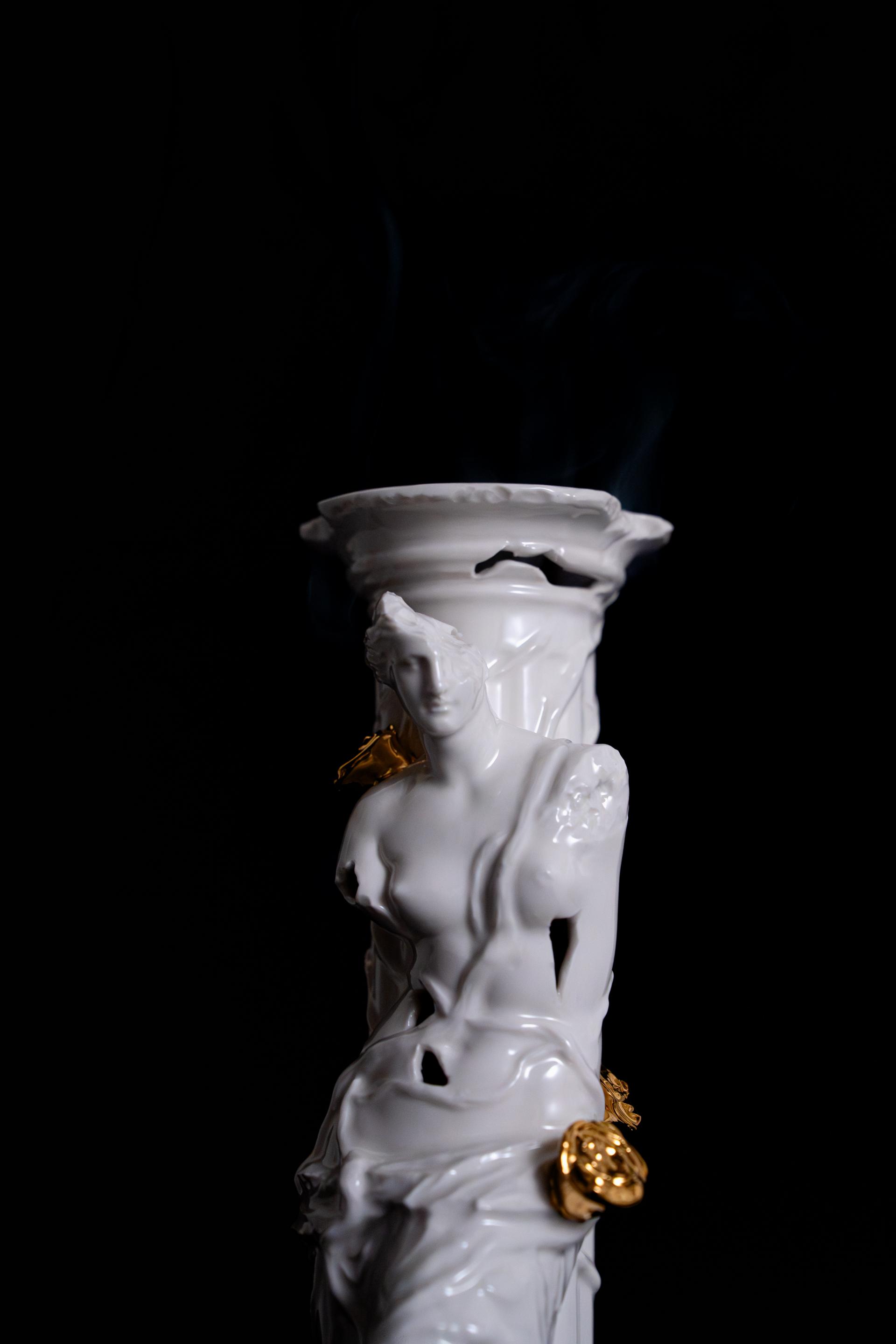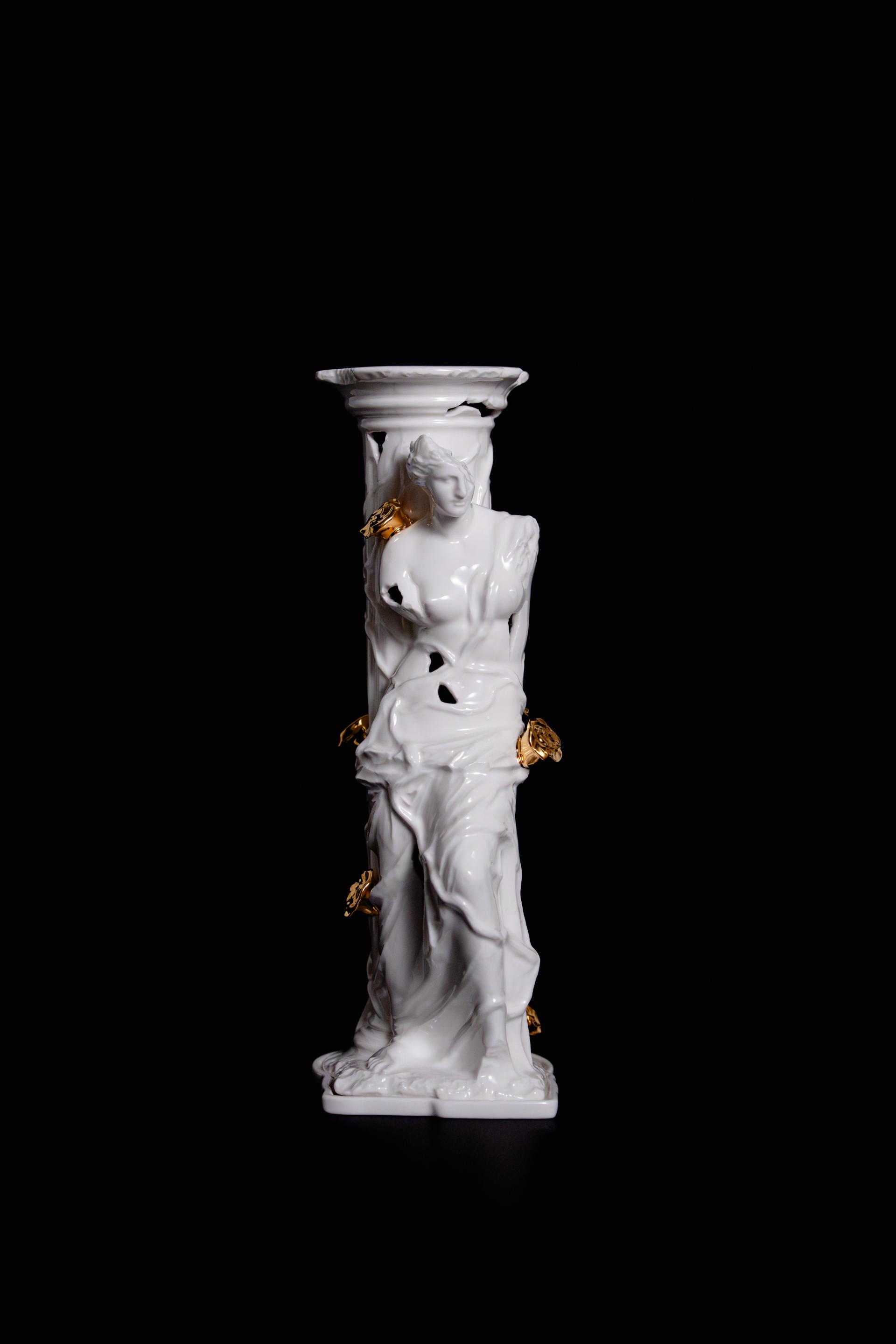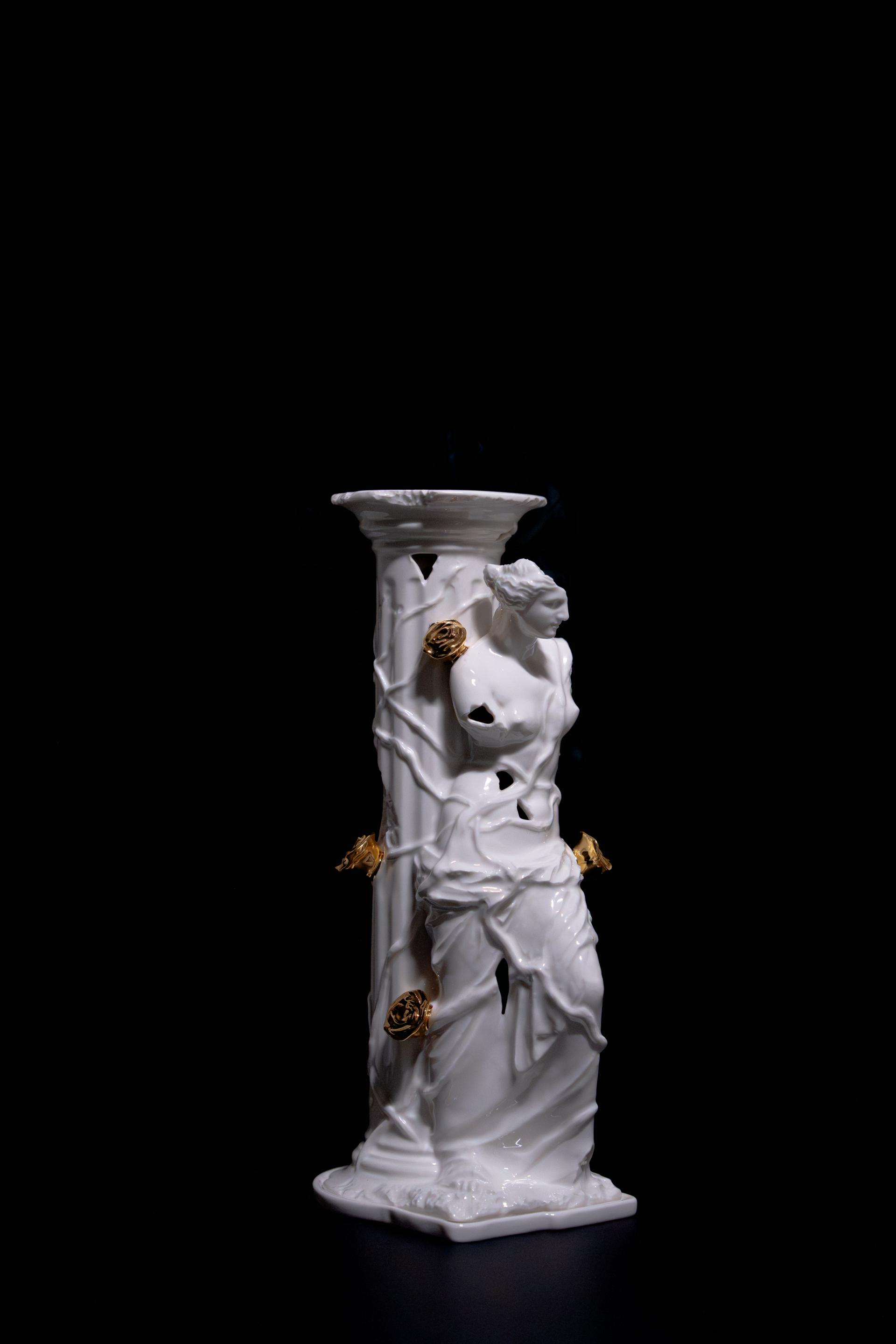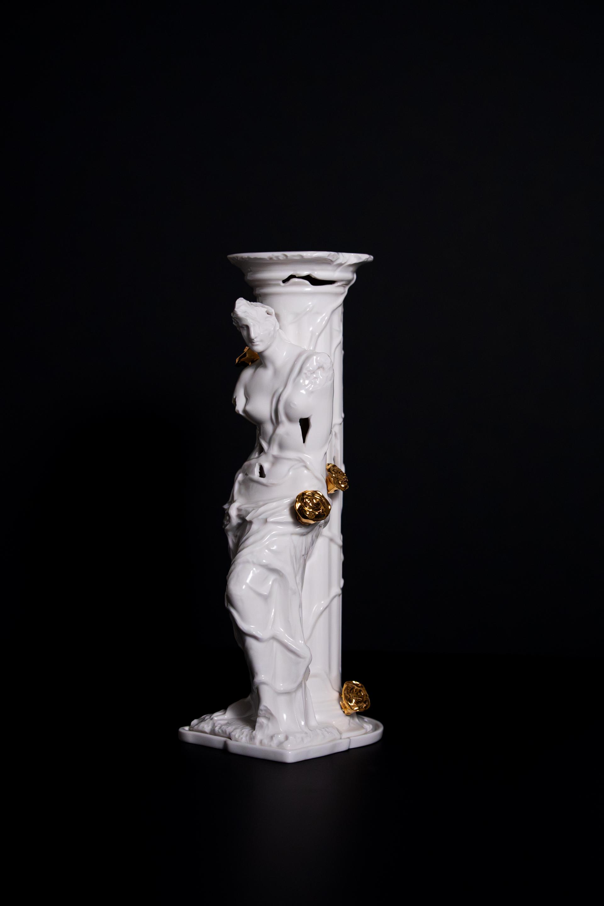 무너진 여성 조각상 위로 금장미가 피어난 형태의 오브제형 챔버.