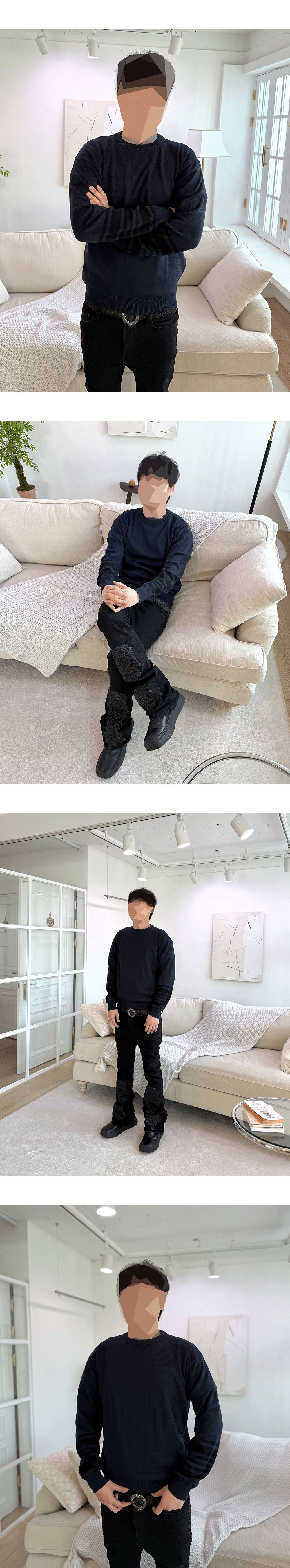 소매 장식으로 포인트를 준 네이비 니트