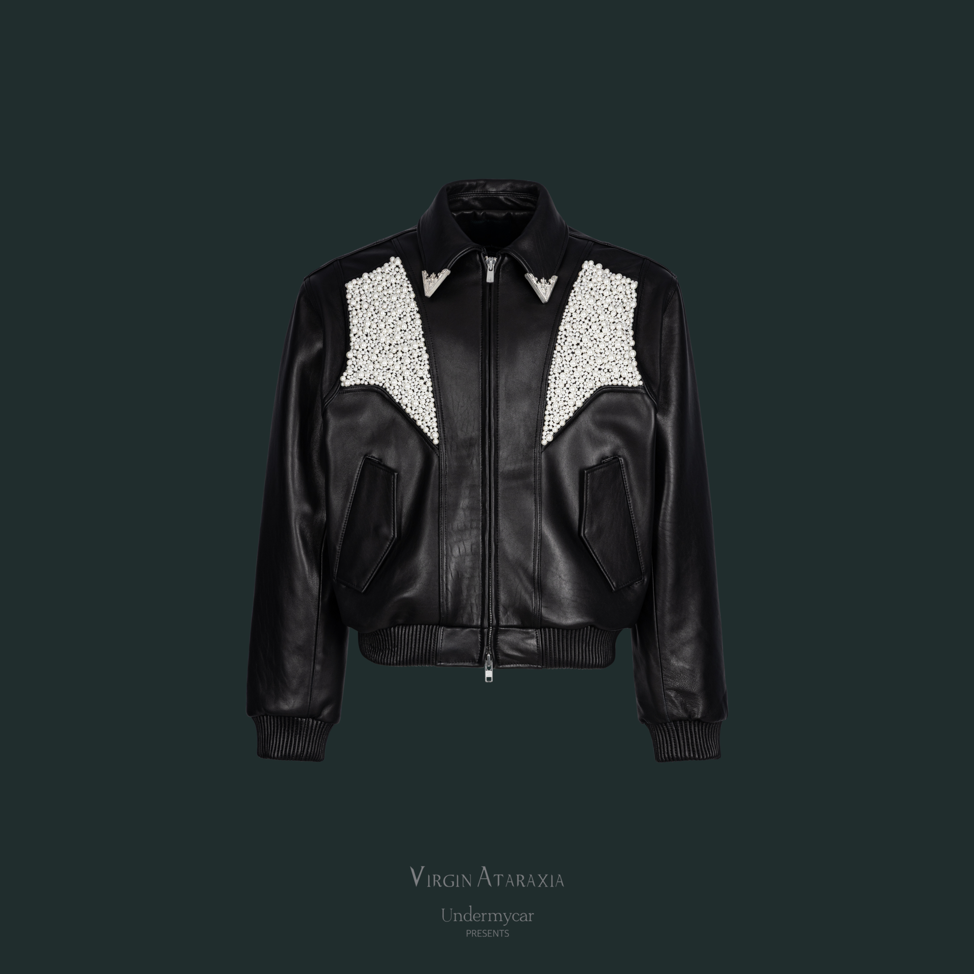 925실버 카라핀과 손으로 한 땀 한 땀 엮은 진주로 장식한 양가죽 블루종입니다.