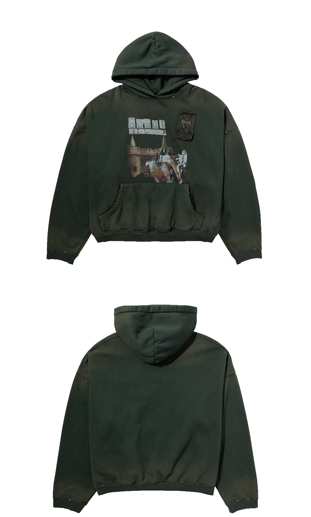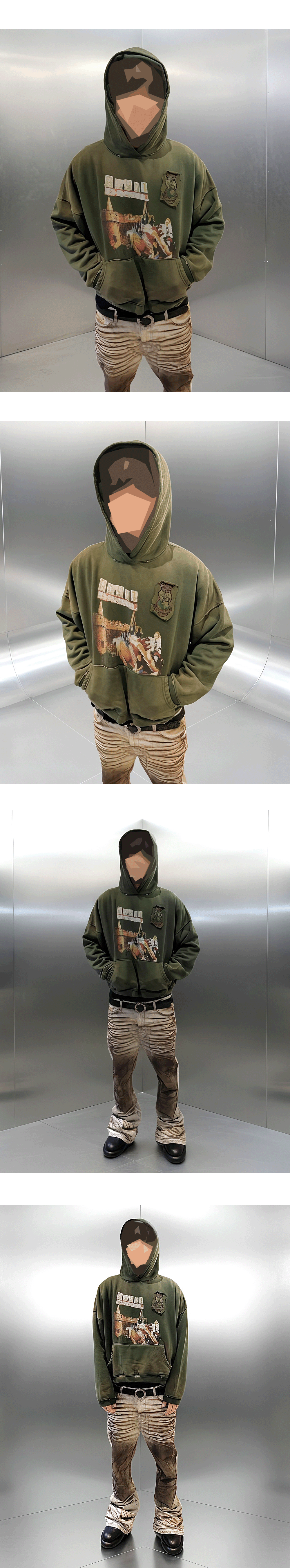 지워진 듯한 흐린 아트워크와 불규칙한 패치워크가 특징인 후드티셔츠
