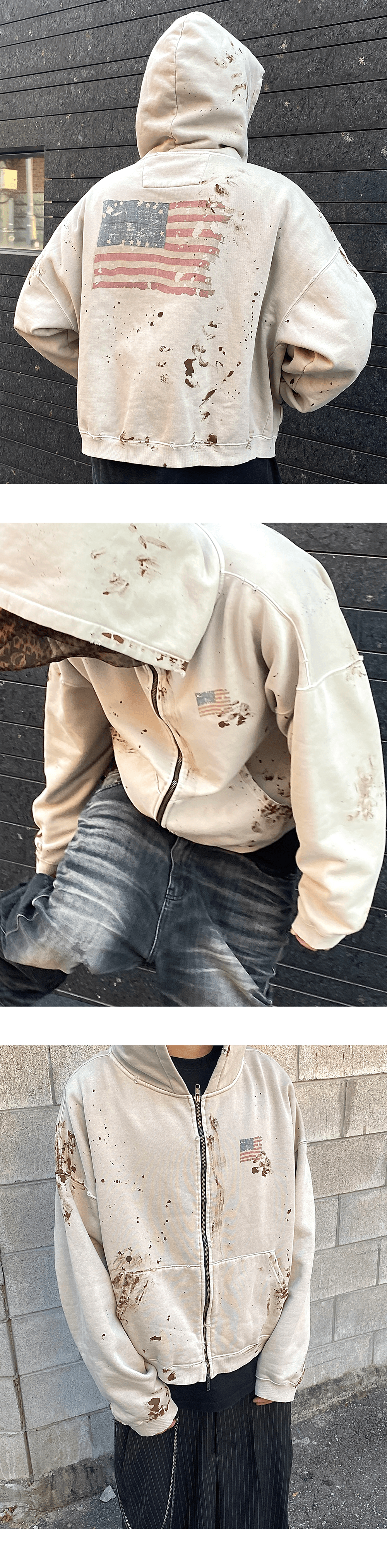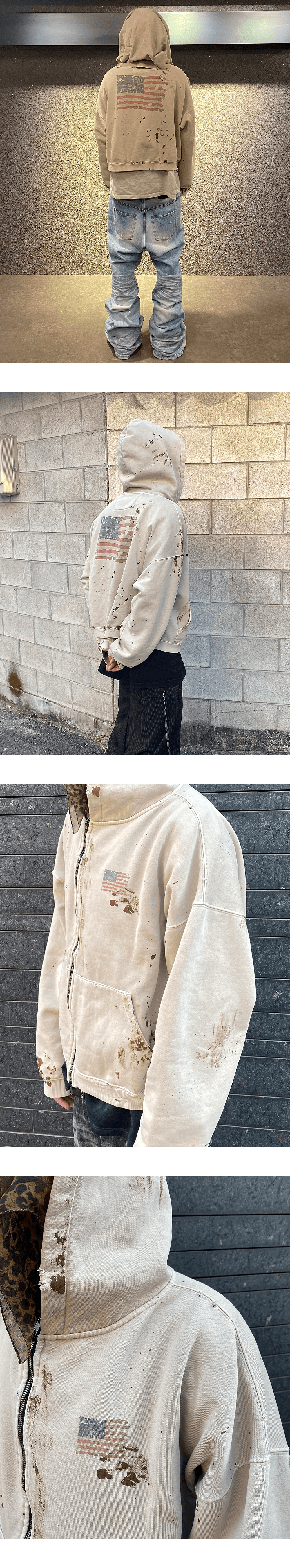 고지를 탈환한 미국군을 연상시키는 빛바랜 성조기가 그려진 허름한 후드집업