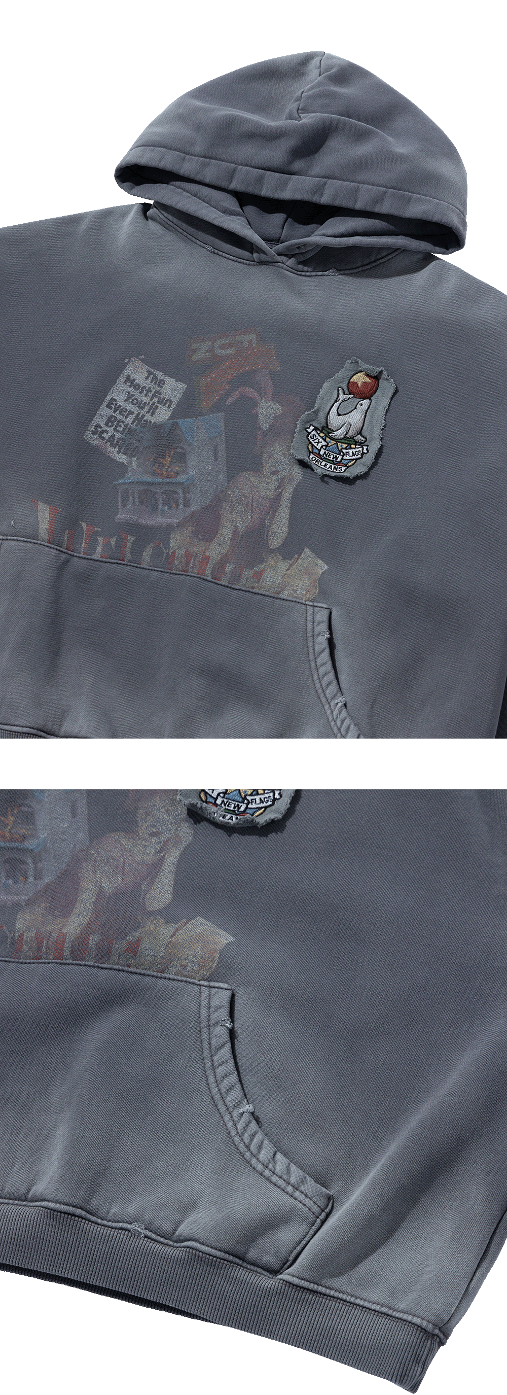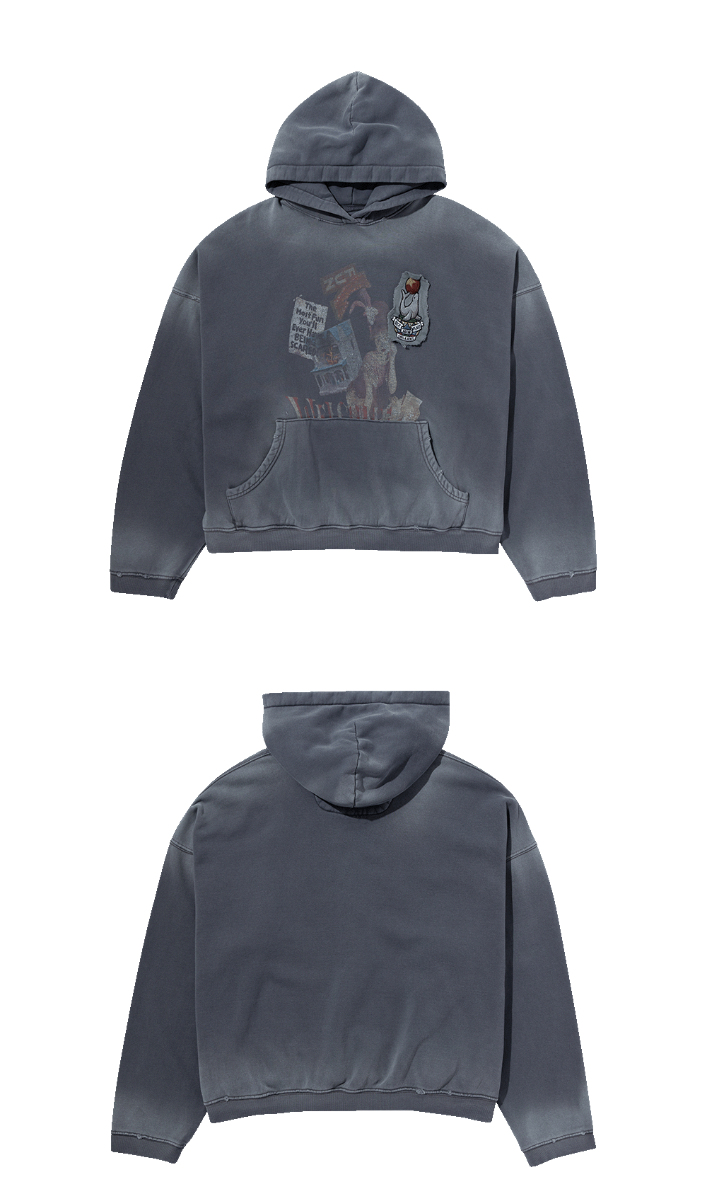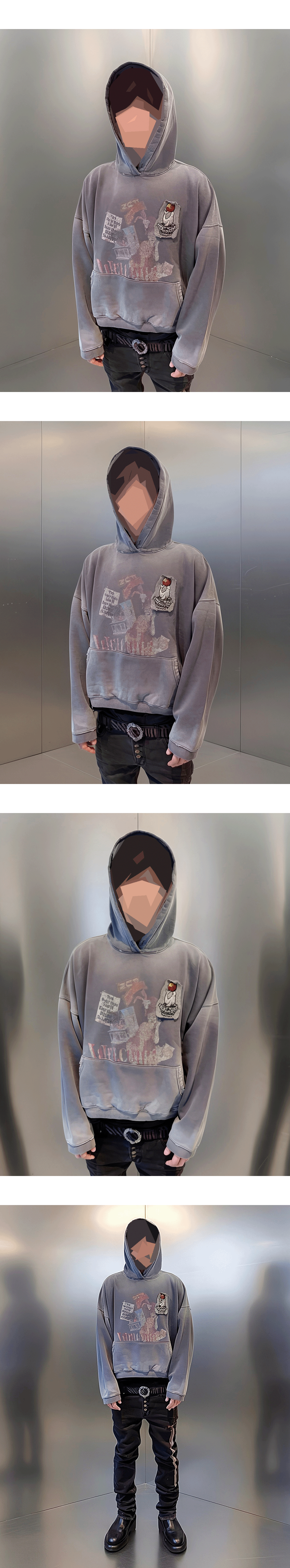 지워진 듯한 흐린 아트워크와 불규칙한 패치워크가 특징인 후드티셔츠